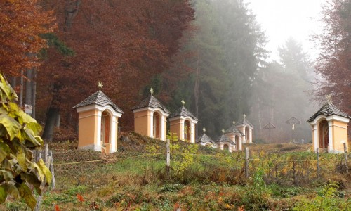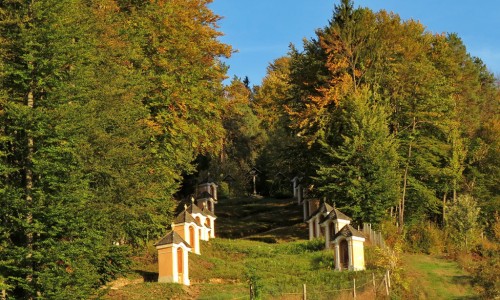 Ob vznožju Starega gradu je Kalvarija s štirinajstimi kapelicami križevega pota in tremi križi na vrhu ter je svojevrstna arhitekturna posebnost. Zgraditi jo je dal smledniški graščak baron Franc Smledniški leta 1772 v osi oziroma ravni črti, ki povezuje Stari grad in Krvavo znamenje, kapelico v spomin na deželnoknežje morišče na polju pod podružnično cerkvijo v Valburgi. Da je lahko uresničil svojo zamisel o postavitvi Kalvarije v ravni črti, je svoje zemljišče zamenjal s sosednjim zemljiščem bližnjega svobodnjaka Jakoba Jeraja. O tem priča tudi pogodba, ena izmed prvih v slovenskem jeziku. Prav zato lahko Kalvarijo vključimo v zrela dela krajinske arhitekture. Leta 2001 obnovljena in osvetljena Kalvarija, ki jo je poslikala Maša Bersan Mašuk, je ena izmed najlepših tovrstnih baročnih stvaritev v Sloveniji.