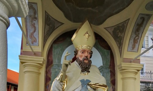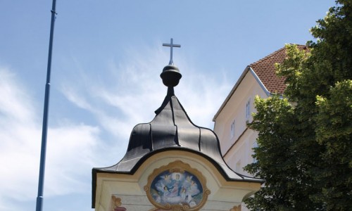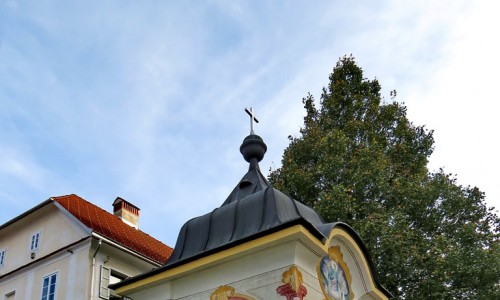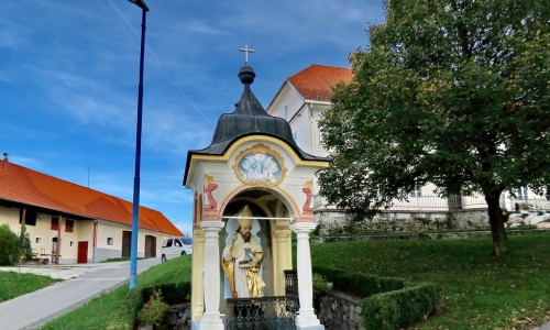 Sam trg je sicer prostorsko vpet med župnijsko cerkev sv. Urha, župnišče in kulturni dom. Pod cerkvijo se nahaja kapelica sv. Urha. Po zatrjevanju strokovnjakov izvira iz devetnajstega stoletja, verjetno pa je bilo znamenje na tem mestu že pred tem, vendar v drugačni obliki, kot ga poznamo danes. Kapelica je bila v celoti poslikana s freskami slikarja Leopolda Layerja, ki je poznan kot avtor slike Brezjanske Marije, in njegovih učencev.