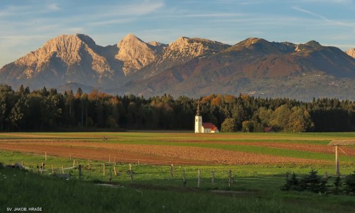 Baročna cerkev, v kateri se je ohranilo veliko starejših gotskih elementov, stoji daleč iz vasi. Po legendi so jo sezidali v vasi, pa tam ni hotela ostati. Prvič se omenja že leta 1118, ko dobi krstno in pogrebno pravico. Tedaj je bila to najbrž preprosta, morda celo lesena cerkvica podobna kapeli, ki je pripadala vodiški fari. Gotska ostanka cerkve sezidane pred letom 1500 so vrata in štiri rozete na stropu, kjer je iz kamna izklesana Mater božja. Baročni oltar iz te cerkve je iz leta 1647, ko je bila cerkev barokizirana. Ladijski prostor je deljen v tri plitve obočne, križno rebraste pole, prezbiterij ima zvezdasto členjen strop z rebri. Zaznamuje jo daleč vidni, celih 25 metrov visok zvonik, na vrhu katerega je značilen oglejski križ, ki nakazuje na gospostvo oglejskih patriarhov. Cerkev je posvečena sv. Jakobu, godovniku Jakoba Aljaža. Apostol Jakob starejši je po navadi upodobljen skupaj s školjko, Jakobova školjka pa je tako postala simbol romarjev in popotnikov. Kip sv. Jakoba je postavljen na glavni oltar, ob straneh pa sta kipa sv. Urha in sv. Nikolaja. Svetemu Jakobu je posvečena še ena cerkev v naši občini, in sicer cerkev na Katarini nad Ljubljano. Pri cerkvi v Hrašah je tudi četrta kontrolna točka Aljaževe poti Od doma do doma.