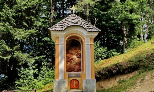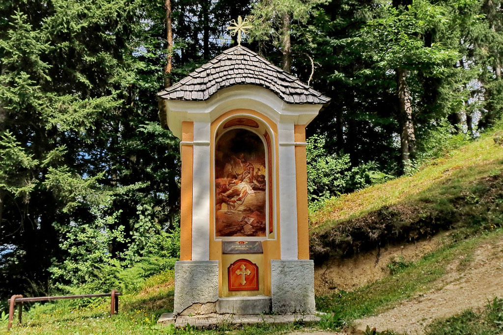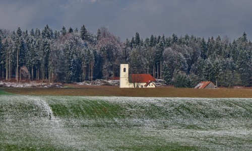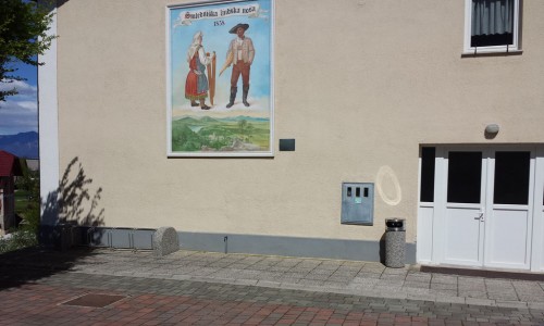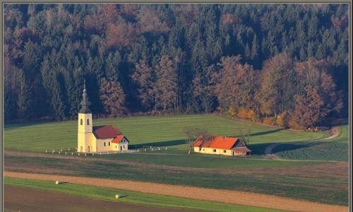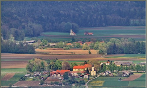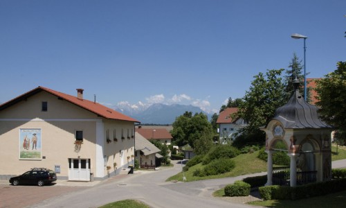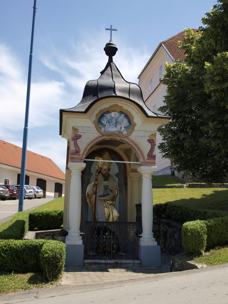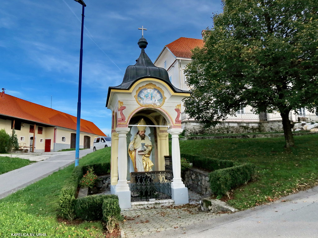 Sam trg je sicer prostorsko vpet med župnijsko cerkev sv. Urha, župnišče in kulturni dom. Pod cerkvijo se nahaja kapelica sv. Urha. Po zatrjevanju strokovnjakov izvira iz devetnajstega stoletja, verjetno pa je bilo znamenje na tem mestu že pred tem, vendar v drugačni obliki, kot ga poznamo danes. Kapelica je bila v celoti poslikana s freskami slikarja Leopolda Layerja, ki je poznan kot avtor slike Brezjanske Marije, in njegovih učencev.