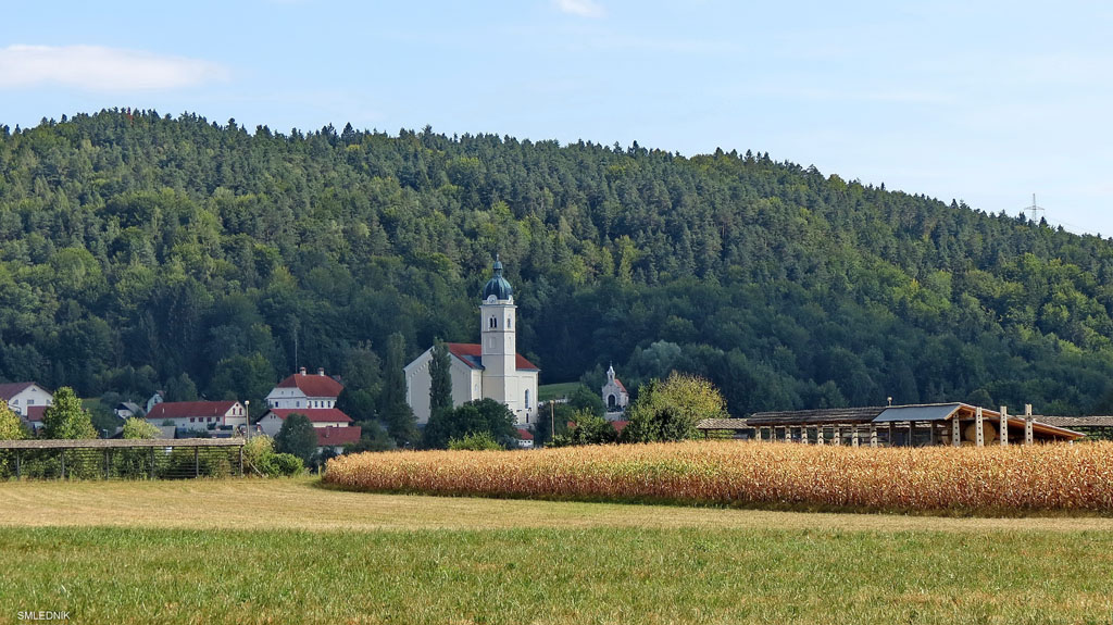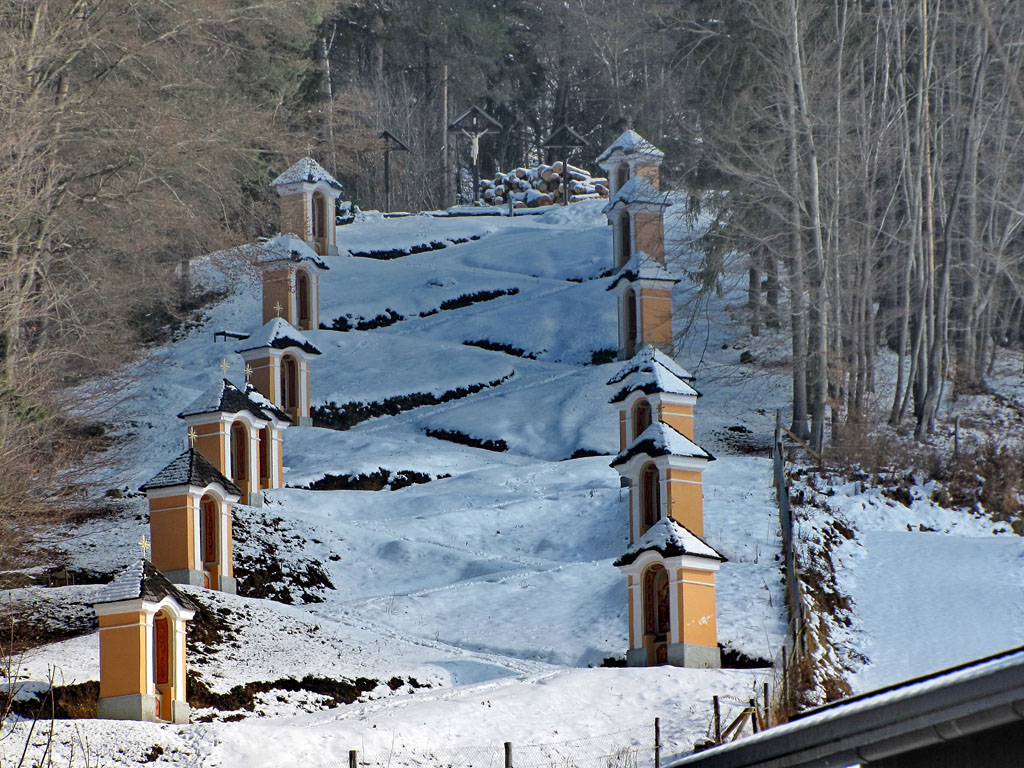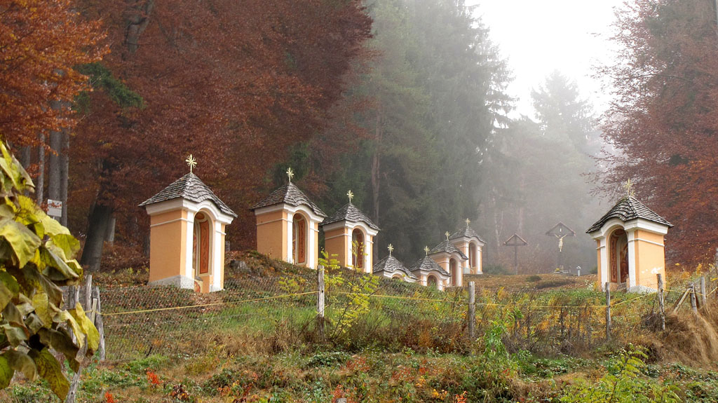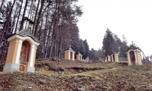 Ob vznožju Starega gradu je Kalvarija s štirinajstimi kapelicami križevega pota in tremi križi na vrhu ter je svojevrstna arhitekturna posebnost. Zgraditi jo je dal smledniški graščak baron Franc Smledniški leta 1772 v osi oziroma ravni črti, ki povezuje Stari grad in Krvavo znamenje, kapelico v spomin na deželnoknežje morišče na polju pod podružnično cerkvijo v Valburgi. Da je lahko uresničil svojo zamisel o postavitvi Kalvarije v ravni črti, je svoje zemljišče zamenjal s sosednjim zemljiščem bližnjega svobodnjaka Jakoba Jeraja. O tem priča tudi pogodba, ena izmed prvih v slovenskem jeziku. Prav zato lahko Kalvarijo vključimo v zrela dela krajinske arhitekture. Leta 2001 obnovljena in osvetljena Kalvarija, ki jo je poslikala Maša Bersan Mašuk, je ena izmed najlepših tovrstnih baročnih stvaritev v Sloveniji.