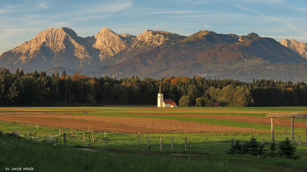 Baročna cerkev, v kateri se je ohranilo veliko starejših gotskih elementov, stoji daleč iz vasi. Po legendi so jo sezidali v vasi, pa tam ni hotela ostati. Prvič se omenja že leta 1118, ko dobi krstno in pogrebno pravico. Tedaj je bila to najbrž preprosta, morda celo lesena cerkvica podobna kapeli, ki je pripadala vodiški fari. Gotska ostanka cerkve sezidane pred letom 1500 so vrata in štiri rozete na stropu, kjer je iz kamna izklesana Mater božja. Baročni oltar iz te cerkve je iz leta 1647, ko je bila cerkev barokizirana. Ladijski prostor je deljen v tri plitve obočne, križno rebraste pole, prezbiterij ima zvezdasto členjen strop z rebri. Zaznamuje jo daleč vidni, celih 25 metrov visok zvonik, na vrhu katerega je značilen oglejski križ, ki nakazuje na gospostvo oglejskih patriarhov. Cerkev je posvečena sv. Jakobu, godovniku Jakoba Aljaža. Apostol Jakob starejši je po navadi upodobljen skupaj s školjko, Jakobova školjka pa je tako postala simbol romarjev in popotnikov. Kip sv. Jakoba je postavljen na glavni oltar, ob straneh pa sta kipa sv. Urha in sv. Nikolaja. Svetemu Jakobu je posvečena še ena cerkev v naši občini, in sicer cerkev na Katarini nad Ljubljano. Pri cerkvi v Hrašah je tudi četrta kontrolna točka Aljaževe poti Od doma do doma.